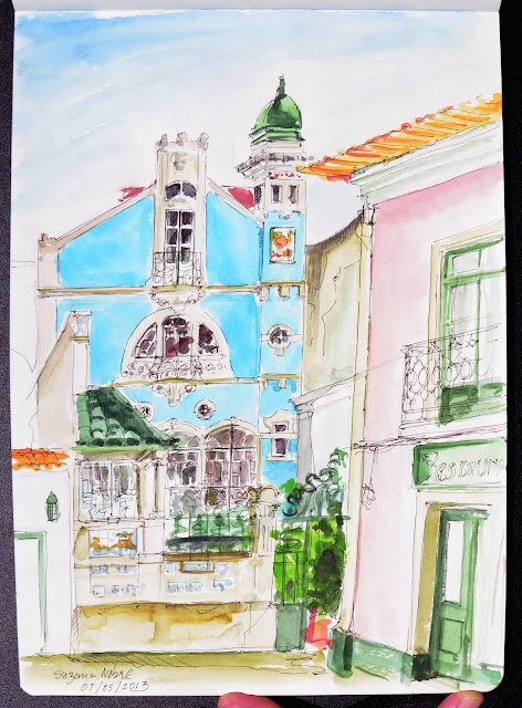 Finalmente uma bela manhã de sol em Aveiro. A ideia era desenhar a parte da frente da Casa Major Pessoa, um dos edifícios mais representativos da Arte Nova em Aveiro, mas havia um mar de turistas nessa zona e então optei pela traseiras, na Praça do peixe. Muitos conselhos se sucederam por quem passava "a menina devia arranjar um banquinho, daqueles dos artistas, assim dá cabo das costas" e a senhora lá de cima da janela " ó menina, está ao sol... olhe a cabeça, então está sem chapéu!!!!"