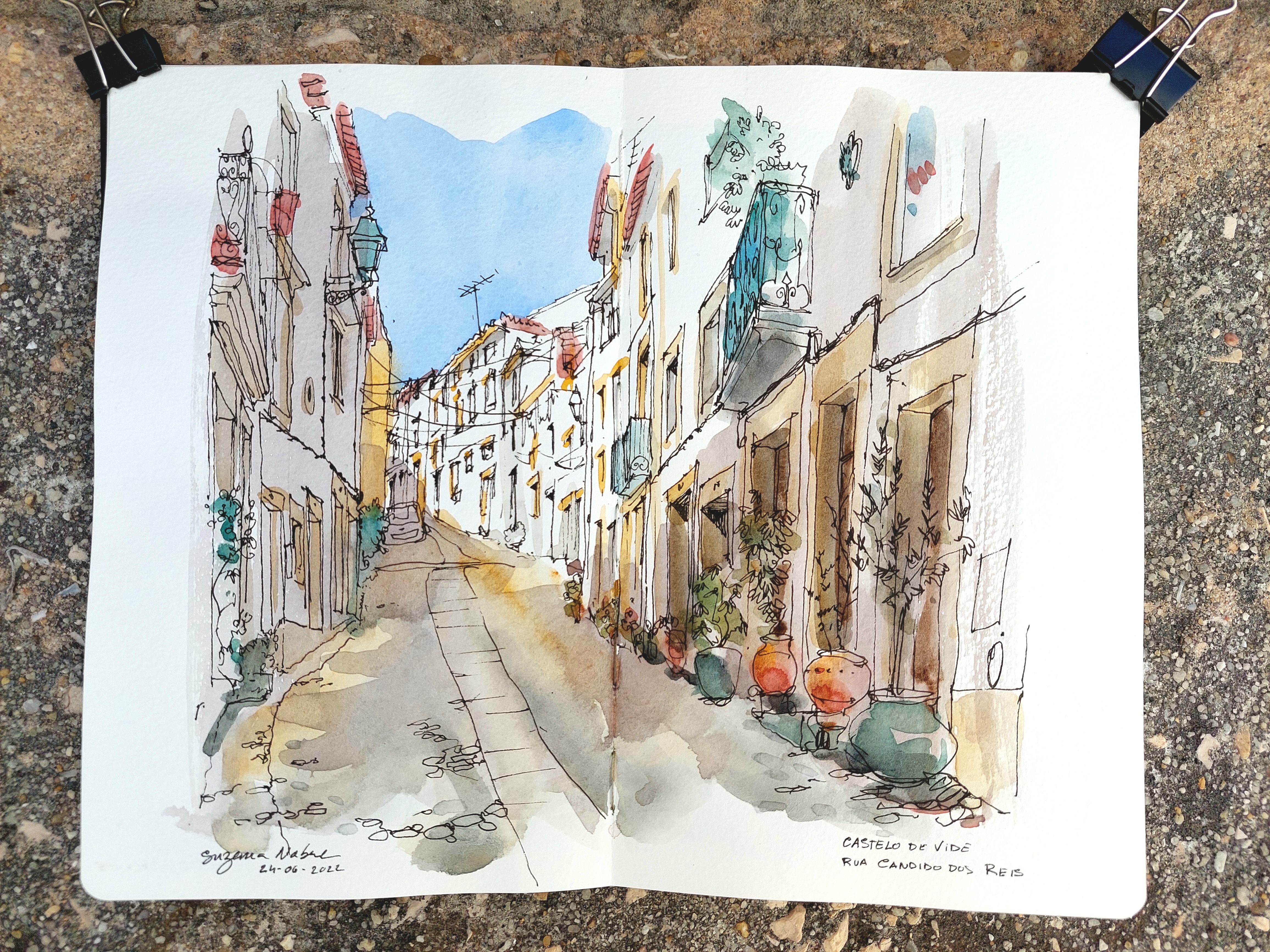 Foi a primeira vez que fiz um desenho in sito de Sortelha, tenho outros mas todos feitos por fotografia. É a terra do meu pai e aqui viveram os meus avós paternos, mesmo em frente à entrada do castelo, dentro do anel da muralha. Levei um mini bloco porque sabia que não ia ter muito tempo, fiz a casa do meu pai nuns minutos livres antes do almoço e o castelo logo depois, com a desculpa de regressar para apanhar laranjas do pátio e a promessa de que só demorava 10 minutos a fazê-lo :). Ficou a vontade de rabiscar mais uns quantos mas ficará para outra altura :)