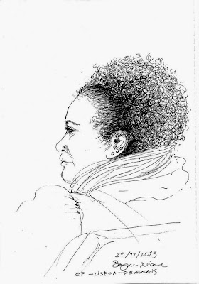 Pelo menos nos fins de semana em que vou a Cascais sei que tenho uma grande possibilidade de ter um bom momento de desenho durante a viagem na linha de Cascais. Na viagem de comboio Aveiro-Lisboa já desisti, é enjoo na certa! Mas nesta linha encontro sempre modelos interessantes, sento-me atrás da minha vítima com a esperança que não saia muito cedo e passo a viagem entretida. Começo a especializar-me em penteados afro, são tão interessantes de desenhar cheios de textura :)