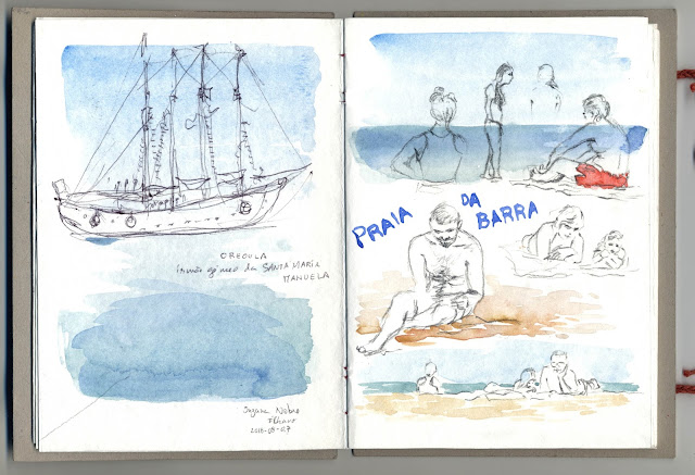 Como se previa um dia mesmo muito quente, optamos por desenhar só de manhã, o que já foi complicado pois as sombras eram raras por ali. Depois do almoço tardio optamos por ir molhar os pés à praia da Barra, a abarrotar de gente, mas que acabou por proporcionar um belo final de encontro pois soprava uma brisa fresca e uma certa neblina que apaziguou as temperaturas :)Mais fotos e desenhos do encontro AQUI